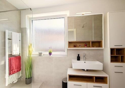• Modernes Badezimmer mit Dusche und Fensterlüftung