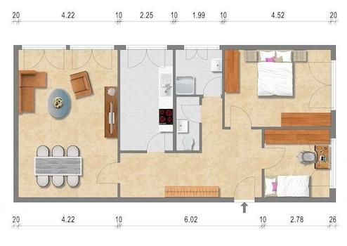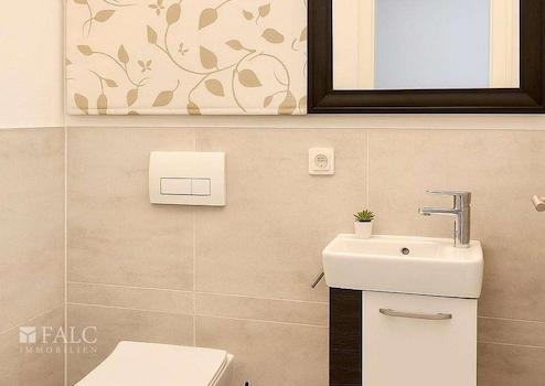 Das Hauptschlafzimmer ist großzügig geschnitten, während das zweite Zimmer flexibel als Kinder-, Arbeits- oder Gästezimmer genutzt werden kann. Das moderne Badezimmer verfügt über eine bodentiefe Dusche und Fensterlüftung; das separate WC sorgt für zusätzlichen Komfort.