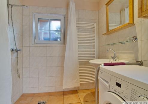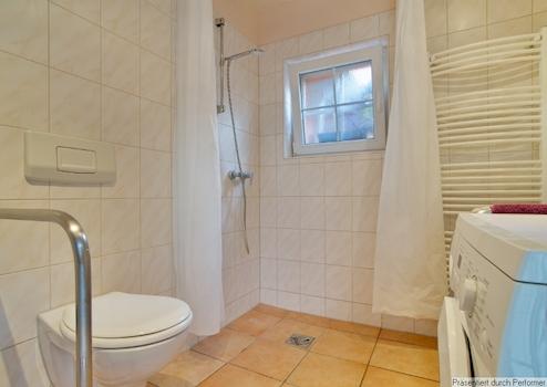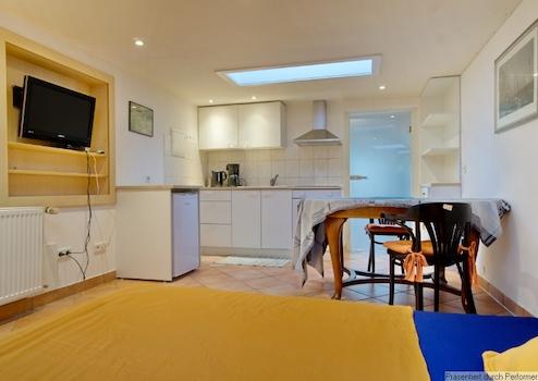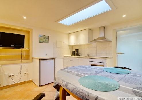 Das Zimmer hat einen Fliesenboden, komplette Möblierung und Internetzugang über W-Lan ist vorhanden. Behindertengerechte Ausstattung/ebenerdiges Wohnen. 1,40 Meter breites Bett, Schiebetüren-Kleiderschrank und ein TV-Gerät im Schlafbereich. Auf der anderen Seite des Raums steht die Küchenzeile mit Induktions-Doppelkochfeld, Backofen, Kaffeemaschine und einer Grundausstattung Geschirr und Kochutensilien. Ein Kühlschrank mit Eisfach ist vorhanden. Das Duschbad hat ein Fenster, Handtuchheizung und Haltegriffe, im Bad ist auch die Waschmaschine untergebracht. Ausgang zur Terrasse mit Blick in den Garten.