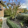 Im Garten gibt es eine Garage für ein Auto und einen Geräteschuppen.