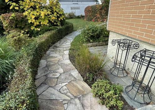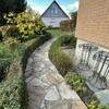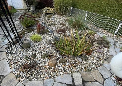 Neben schönen Blumenrabatten ist auch ein kleiner Teich mit Bachlauf angelegt.