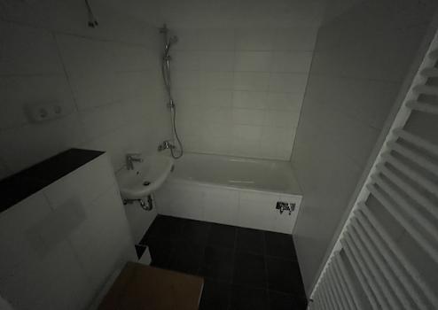 - gefliestes innenliegendes Badezimmer mit Wanne und Handtuchheizkörper