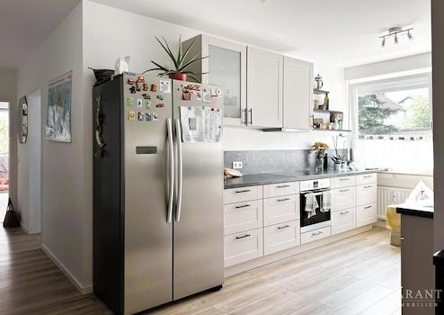 Eine zur Diele offen gestaltete Küche ist mit einer modernen und stilvollen Einbauküche (2021) ausgestattet und fügt sich harmonisch in das Wohnkonzept ein.