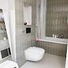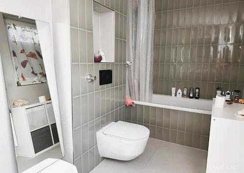 Das moderne und funktionale Tageslichtbad mit Badewanne, WC, stilvollen Fliesen und Deckenspots schafft eine entspannte Atmosphäre.