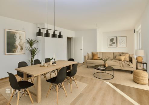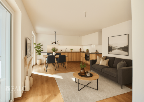 Das Herzstück der Wohnung bildet der großzügige Wohn- und Essbereich mit offener Küche. Hinzu kommen ein helles Schlafzimmer, ein stilvolles Badezimmer sowie ein Balkon, der zum Entspannen einlädt.
