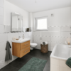 Die Wohnung ist hochwertig ausgestattet: dreifach verglaste Kunststofffenster mit elektrischen Rollläden, Fußbodenheizung und ansprechende Bodenbeläge aus Laminat und Fliesen-Steinzeug.