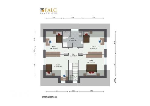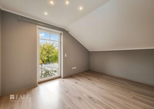 Im Dachgeschoss stehen insgesamt vier Schlafzimmer zur Verfügung, die flexibel als Kinder-, Arbeits- oder Gästezimmer genutzt werden können – ideal für größere Familien oder Menschen mit Home-Office-Bedarf. Ein geräumiges Familienbad mit Eckbadewanne und Dusche bietet hohen Komfort. Das Elternschlafzimmer liegt ruhig zur Gartenseite und bietet viel Stellfläche.