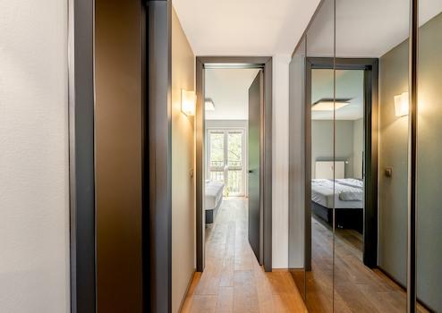 Zwischen Wohnzimmer und Schlafzimmer sowie im Schlafzimmer selbst befindet sich ein großzügiger, maßgefertigter Einbauschrank, der elegantes Design mit praktischem Stauraum verbindet.
