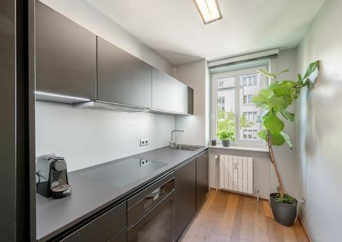 Die separate Küche ist über eine elegante Schiebetür zugänglich und mit einer hochwertigen Einbauküche ausgestattet.