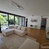 Wohnzimmer mit Sofa und Essbereich und Zugang zur Terrasse mit Garten.