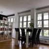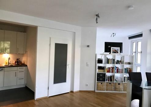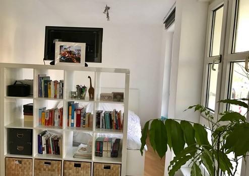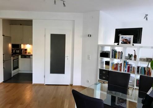 Der offene Wohnbereich mit angrenzender Einbauküche (inkl. Kühl-Gefrier-Kombination, Herd und Miele-Geschirrspülmaschine) ist lichtdurchflutet und bietet Raum zum Wohlfühlen. Der Schlafbereich lässt sich durch einen Raumtrenner dezent abtrennen. Mit kleineren Veränderungen an der Raumaufteilung kann die Wohnung zudem in eine echte Zwei-Zimmer-Wohnung umgestaltet werden.