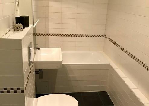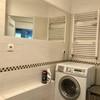 Das innenliegende Badezimmer ist mit einer Badewanne und einem Platz für den im Kaufpreis enthaltenen Waschtrockner ausgestattet.