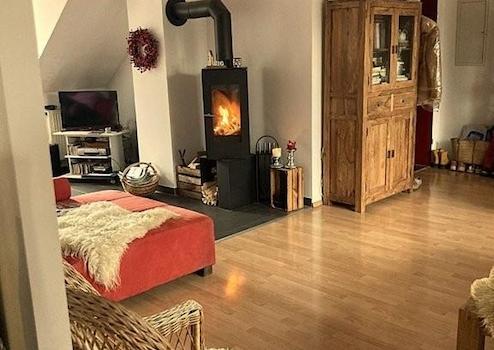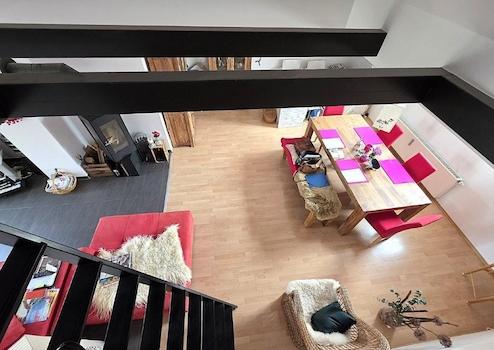 Raumaufteilung: offenes Wohnen/Essen/Küche; Lichtdurchflutet mit Empore in den Dachstuhl ausgebaut; Schlafzimmer, Kinderzimmer mit Empore und Schlafplatz im Giebel; sichtbare ausgebaute Dachbalken laden Kinder zum Schaukel ein, oder für ein Workout! - Terrasse: große 30m² an den Dachstuhl gebaut, freihängend, mit 2 Gauben Eingängen in die Wohnbereiche; Sonne und Schattenplätze garantiert.