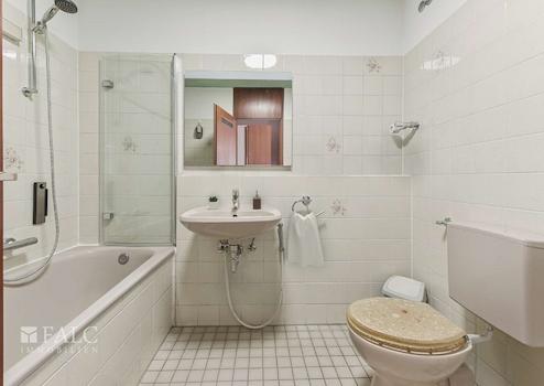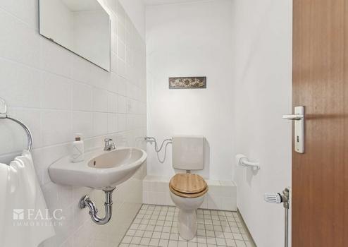 Das Badezimmer verfügt über eine Badewanne, ein WC, ein Waschbecken und eine Waschmaschine. Ein separates Gäste-WC rundet das Angebot ab.