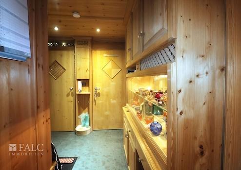 Beim Betreten der Wohnung empfängt Sie ein einladender Flur, der zentralen Zugang zu allen Räumen gewährt. Bereits hier zeigt sich die besondere Liebe zum Detail: Maßgefertigte Einbauschränke für Jacken und Schuhe, rustikale Holztüren, eine Holzdecke sowie eine beleuchtete Vitrine sorgen für ein stimmiges Entree. Sie spiegeln das traditionelle Flair des bayerischen Oberlands wider und verleihen dem Zuhause eine warme, wohnliche Atmosphäre.