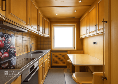 Direkt angrenzend befindet sich die Küche, die ebenfalls mit maßgefertigten Schreinerarbeiten ausgestattet ist. Ein kleiner Esstisch bietet Platz für gemeinsame Mahlzeiten.