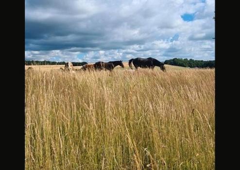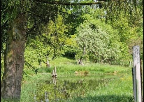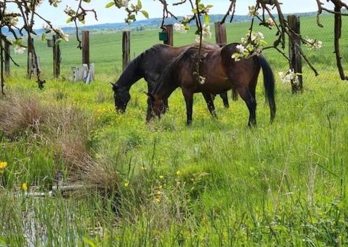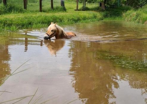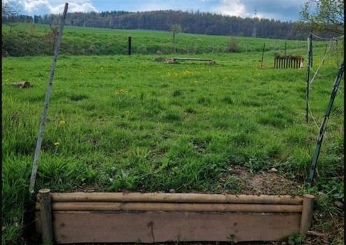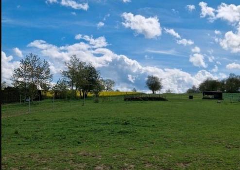 Die Teiche werden vom angrenzenden Bach gefüllt. Um immer Wasser zu gewähren befindet sich außerdem ein 31m! tiefer Brunnen auf dem Grundstück. Auf der Weide befindet sich derzeit noch ein kleiner Geländeplatz mit Naturhindernissen, auch hier ist ein weiterer Ausbau möglich.