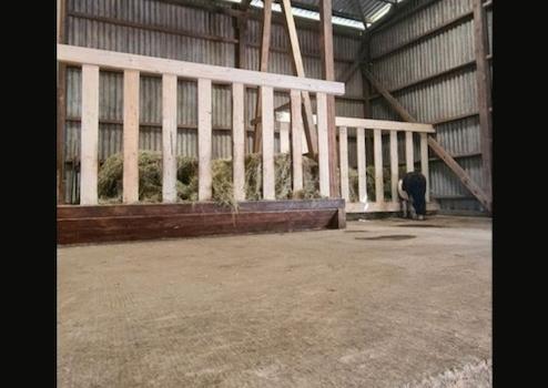 Der Liegebereich beträgt ca 100m², außerdem befinden sich dort zwei große Heuraufen mit 16 Fressplätzen und Platz für bis zu 9 Rundballen auf nochmal ca 100m².