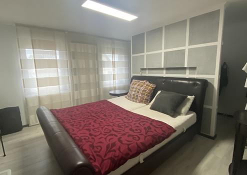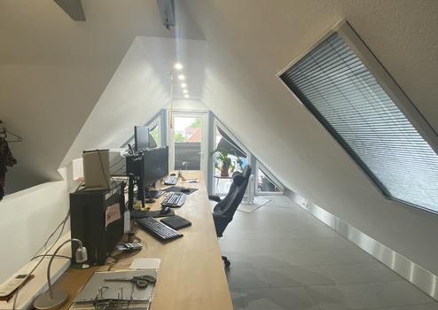 Ein separates Highlight ist die über eine Außentreppe erreichbare, vermietete Wohneinheit im Obergeschoss. Diese verfügt über ein Schlafzimmer, ein Wohnzimmer, eine Küche, ein modernes Badezimmer mit Dusche sowie einen ausgebauten, klimatisierten Spitzboden, der aktuell als Büro genutzt wird. Von hier aus gelangen Sie auf die großzügige Dachterrasse, die zum Entspannen und Genießen der Sonnenstunden einlädt.