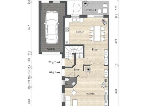 Das Erd- und Kellergeschoss bilden eine großzügige Wohneinheit mit sechs Zimmern, davon bis zu fünf Schlafzimmern. Zwei Terrassen mit direktem Gartenzugang, ein praktischer Hauswirtschaftsraum und ein Gäste-WC runden das Raumangebot ab. Diese Einheit ist derzeit leerstehend und kann somit kurzfristig selbst bezogen oder neu vermietet werden.