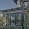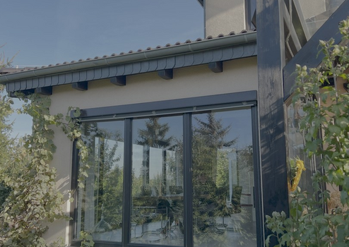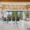 Die Terrasse hat ein Dach und einen Windschutz aus Glas.