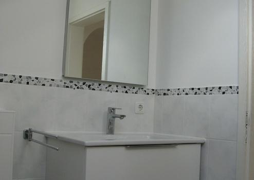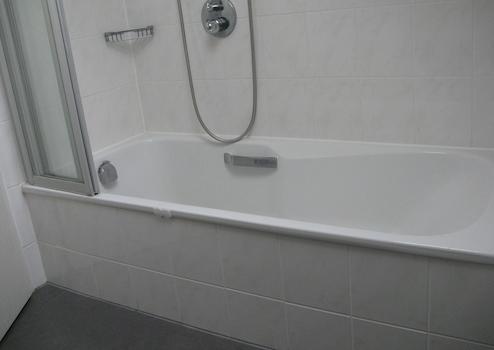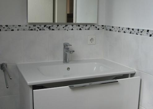 Das Badezimmer wurde von uns mit einem Waschtisch/Spiegel und einer neuen Toilette ergänzt. Die Badewanne ist halb hoch, kann so gut als Duschwanne genutzt werden.