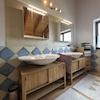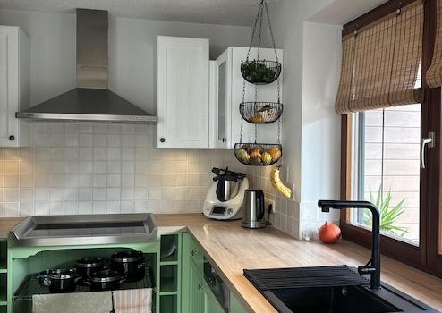 Die maßgefertigte Landhausküche hat in diesem Jahr einen frischen Anstrich, eine neue Arbeitsfläche und Spüle und dadurch ein pfiffiges neues Aussehen bekommen. So verbindet sich Qualität mit modernen Farben und fügt sich harmonisch in das Gesamtbild ein. Der kleine Vorratsraum nebenan bereichert durch erweitertes Platz- und Aufbewahrungsangebot.