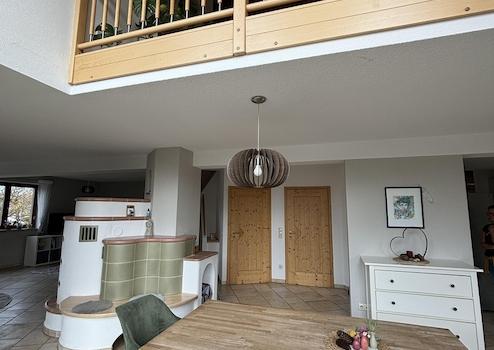 Mittig im Raum befindet sich ein Kachelofen (Grundofen), der es in den Übergangszeiten und im Winter gemütlich warm werden lässt und, durch das offene Wohnkonzept, auch die Zimmer im Obergeschoss mit heizen kann.