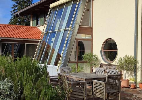 Ebenso erreicht man von dort aus die Terrassen auf der Ost-, Süd- und Westseite, und den weitläufigen, eingewachsenen Garten, der von einem Gartenarchitekten geplant und mit den unterschiedlichsten Sträuchern und Bäumen bepflanzt wurde. Hier findet man mehrere geschützte Rückzugsorte zum Verweilen. Vor drei Jahren wurde ein neues Gerätehaus errichtet, das alle nützlichen Gartengeräte beherbergt.