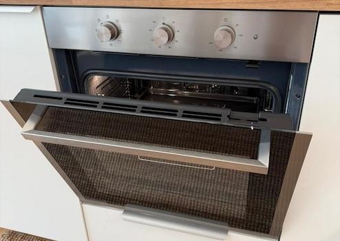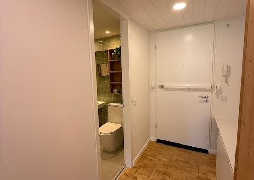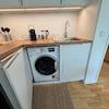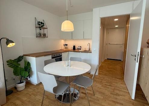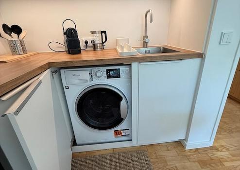 Der moderne Wohn- und Schlafbereich bietet ein Echtholzbett (1,40 x 2,00 m), einen 43" 4K-Smart-TV und maßgefertigte Einbauschränke. Die offene Designerküche ist mit Spülmaschine, Induktionskochfeld, Backofen, Kühlschrank, Nespressomaschine und einem Waschtrockner ausgestattet. Glasfaser-Internet (500 Mbit/s) ist inklusive.