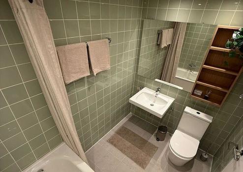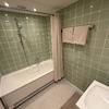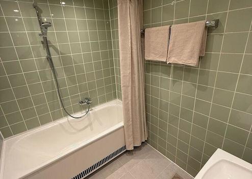 Das Bad ist mit einer Duschbadewanne und hochwertigen Grohe-Armaturen ausgestattet.