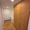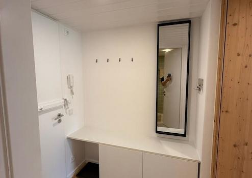 3. Stock mit Lift. Kombinierter Wohn-/Schlafraum mit komfortablem Doppelbett und kleinem Tisch mit Stühlen und Esstheke. Im Wohn-/Schlafraum integrierte Kochnische mit Backofen. Weißes Bad mit Badewanne. Im Flur ...