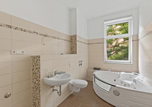 Einfach mal abtauchen können Sie in Ihrer neuen Eckbadewanne, die zu ausgiebigen Bädern einlädt. Des Weiteren überzeugt das erstklassige Bad mit großen Fliesen, einem Waschmaschinenanschluss und vielen Abstellmöglichkeiten.