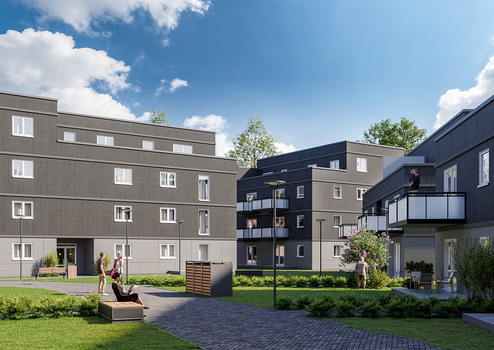 Neubau Eigentumswohnungen - 6 Mehrfamilienhäuser mit insgesamt 72 Wohnungen werden in klimaschonender Massivholz-Bauweise mit industriell vorgefertigten Wand- und Deckenelementen (serielle Fertigung) errichtet. Jedes der Gebäude verfügt über ein eigenes Treppenhaus und Fahrstuhl bis zur Tiefgarage, sodass Sie auf möglichst kurzem Wege komfortabel in jede Wohnetage gelangen. Jeder Wohnung ist ein abschließbarer Kellerraum zugeordnet. Die Häuser verfügen über einen ebenerdigen, überdachten Zugang sowie eine barrierearme Ausführung. So sind die Bäder beispielsweise mit großen, bodenebenen Duschen ausgestattet und die Austrittsschwellen der Balkone und Terrassen sind nur ca. 1 cm hoch.
