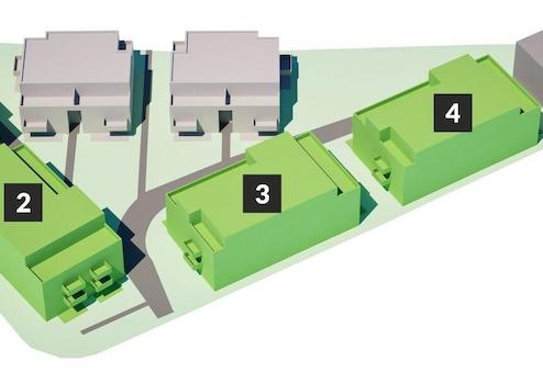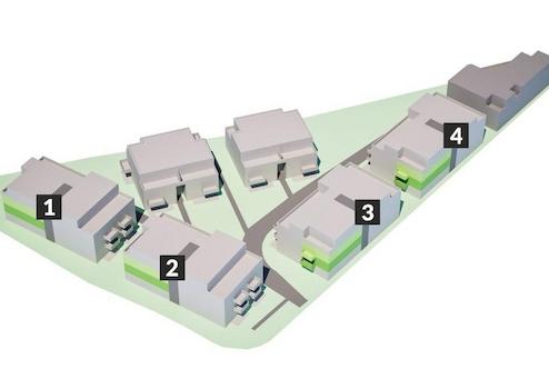 Die 6 Mehrfamilienhäuser und ihre dazugehörigen Zuwegungen sind so angeordnet, dass im Innenhof - geschützt und von der Straße abgewandt - großzügig dimensionierte Grünflächen und für die kleinsten Bewohner ein gut einsehbarer Spielplatz entstehen.