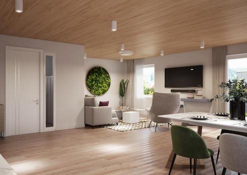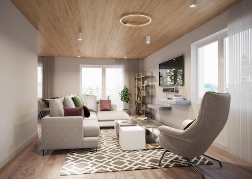 - Wände weiß gestrichen, Decke in Sichtholzqualität