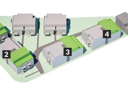 Die 6 Mehrfamilienhäuser und ihre dazugehörigen Zuwegungen sind so angeordnet, dass im Innenhof - geschützt und von der Straße abgewandt - großzügig dimensionierte Grünflächen und für die kleinsten Bewohner ein gut einsehbarer Spielplatz entstehen.