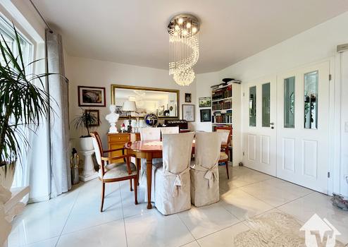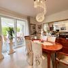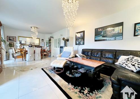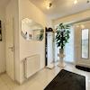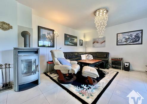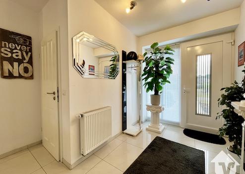 Das Haus bietet Ihnen auf ca. 109,93 m² Wohnfläche einen idealen Grundriss mit viel Licht und Ausblick ins Grüne. Im Eingangsbereich heißt Sie ein stilvolles Foyer mit praktischem Gäste-WC willkommen. Von hier gelangen Sie direkt in den Wohnbereich mit Kaminofen, der mit großen Fensterfronten einen herrlichen Blick in den liebevollen und gepflegten Garten eröffnet.