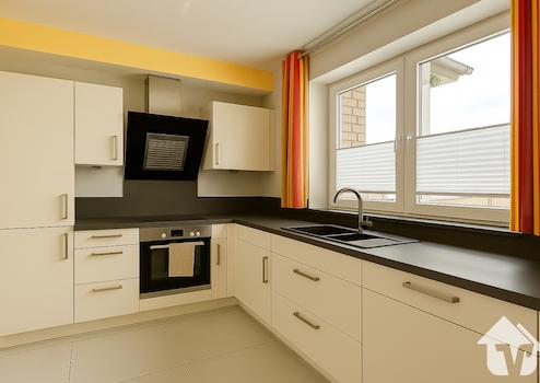 Die separate Küche überzeugt mit klarem Schnitt und direktem Zugang zum angrenzenden Hauswirtschaftsraum. Von hier gelangen Sie komfortabel in die Garage mit integrierter Werkbank – ein durchdachtes Detail für Hobby und Organisation.