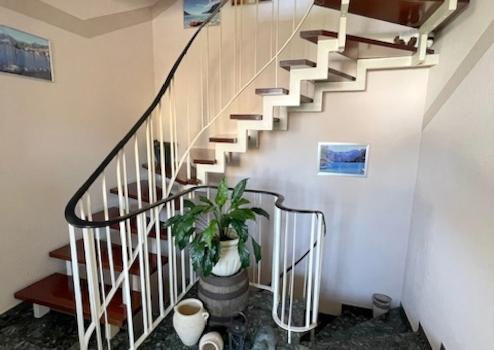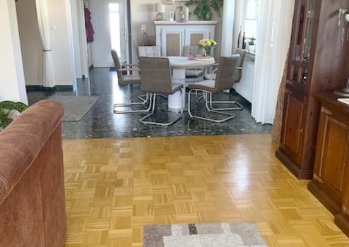 Die Immobilie besteht aus zwei separaten Hälften (die rechte Hälfte ist frei), die jeweils über vier Zimmer plus Essdiele, eine Küche, ein Badezimmer und ein Gäste-WC verfügen.