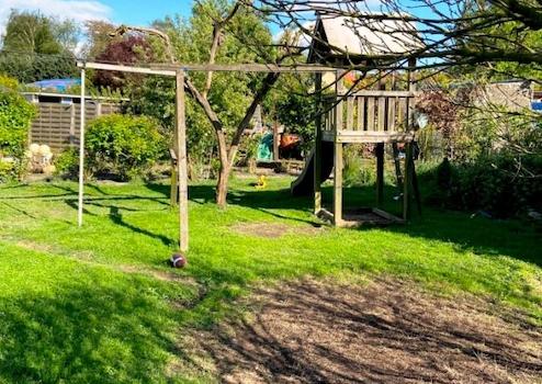- Toskansicher Garten mit großen Rosenbüschen, Streuobstwiese und einem Spielplatz – ein kleines mediterranes Paradies für Kinder und Erwachsene