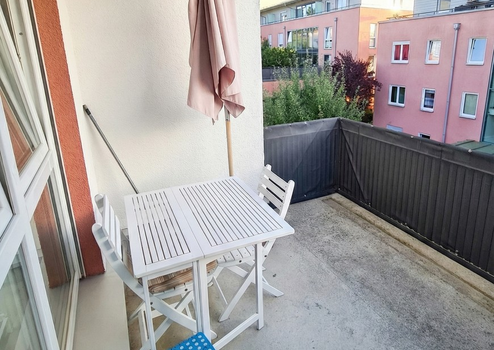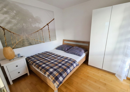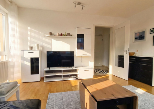 Das Wohn- und Schlafzimmer sind mit Parkettboden versehen. Große Fensterflächen sorgen für ein freundliches Raumgefühl. Die Wohnung wird möbliert verkauft, sodass sie sofort bezugsfertig ist – ideal für Eigennutzer, die ohne Aufwand einziehen möchten.