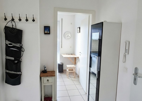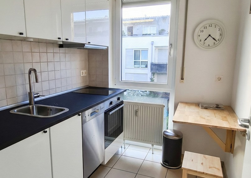 Das Badezimmer ist hell gefliest und mit einer Duschwanne ausgestattet. Ein moderner, leiser Waschtrockner ist bereits integriert. Die Küche ist komplett ausgestattet – inklusive Einbauküche mit Herd, Ofen, Geschirrspüler, Kühlschrank mit Gefrierfach sowie sämtlichem Geschirr und Küchenzubehör.
