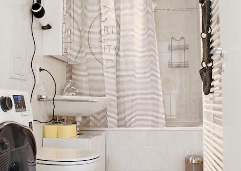 - Badezimmer mit Duschwanne, Spiegelschrank, Waschtrockner