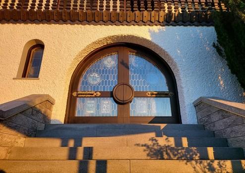 Besondere Fenster: Die Immobilie verfügt über aufwendige Fenster mit mittelalterlichen Bildern, die einen einzigartigen Charme verleihen.