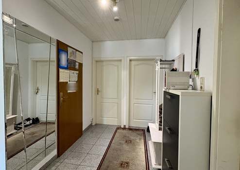 Über den einladenden, großzügigen Flur sind alle Zimmer separat begehbar, was eine ideale Aufteilung für eine WG oder Familiennutzung schafft. Die vier hellen Zimmer bieten vielseitige Gestaltungsmöglichkeiten als Schlafzimmer, Arbeits- oder Wohnzimmer. Von der geräumigen Küche gelangt man direkt in das angrenzende Esszimmer.