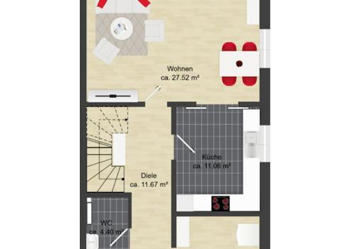 Beim Betreten des Hauses empfängt Sie eine großzügige Diele mit ausreichend Platz für eine Garderobe. Direkt angrenzend befindet sich das stilvoll gestaltete Gäste-WC mit ebenerdiger Dusche.