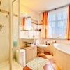 Das moderne Tageslichtbad in ansprechendem zeitlosen Fliesendesign ist mit Dusche und Eckwanne ausgestattet.