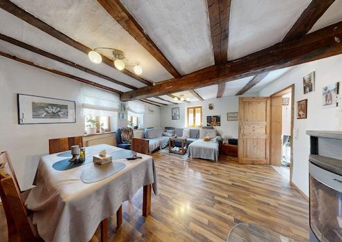 Das separate Wohnhaus ist ein Teil von drei Einheiten und wird als Wohnungeigentum Nr.3 mit Stellplatz, Lageraum und Freisitz im Schuppen verkauft.