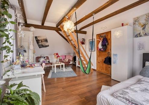 Das Herzstück der Immobilie bildet die großzügige Hauptwohnung im Haupthaus. Sie erstreckt sich über das erste Obergeschoss und das Dachgeschoss und bietet auf rund ca. 150,35 m² viel Raum für individuelles Wohnen. Im ersten Obergeschoss empfängt ein weitläufiger Wohnbereich mit Kamin, der eine behagliche Atmosphäre für warme, wohlige Abende schafft. Die angrenzende, helle Küche verfügt über einen direkten Zugang zur großen Terrasse – ideal für gesellige Runden und entspannte Stunden im Freien. Ein Schlafzimmer, ein Gäste-WC sowie ein großes, modernes Badezimmer mit freistehender Badewanne und Dusche laden hier zum Entspannen ein. Eine einladende Diele mit offenem Treppenaufgang verbindet die beiden Wohnebenen auf stilvolle Weise. Im Dachgeschoss öffnet sich unter dem charmanten Fachwerkdach ein wahres Kinderparadies. Zwei geräumige Zimmer mit hohen Decken bieten reichlich Platz zum Spielen, Lernen und Träumen. Eines der Zimmer überrascht mit einer originellen Hochebene, die als Spielecke genutzt werden kann. Ein weiteres Tageslichtbad mit Dusche sorgt dafür, dass auch auf dieser Ebene der Komfort nicht zu kurz kommt.